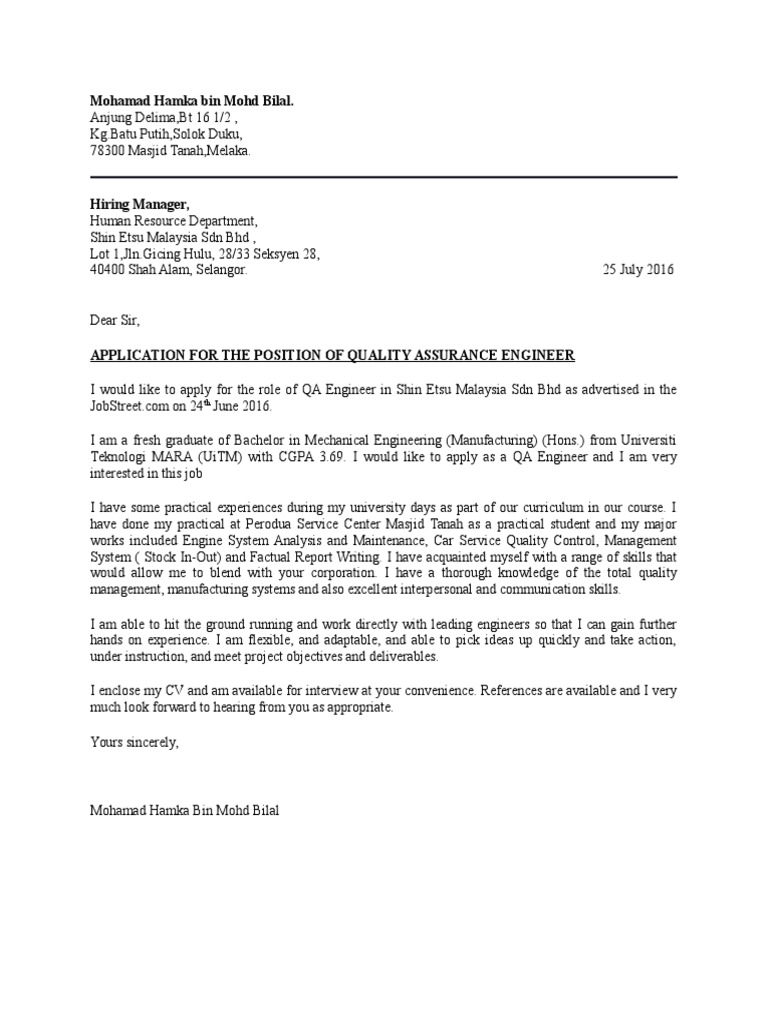 This is a sample cover letter. Read more for these application letter samples for fresh graduates as a guide. Scroll through the sections that follow and find the type of cover letter that matches the type of job you're applying for (the different jobs are categorized by industry). The term "application letter" and "cover letter" are often used interchangeably though both are different when it comes to purpose, content, and length. Rather, use these samples for inspiration. When you're applying for a job, a cover letter lets you show a personal side and demonstrate why hiring you is a smart decision. I have just graduated with honors from duquesne university with a degree in integrated marketing communications, which i believe makes me a strong. Below is a good sample cover letter: Jun 16, 2005 · cover letter sample and template. Cover letters should be around three paragraphs long and include specific examples from your past experience that make you qualified for the position. Great place to work jobstreet stories. Jul 22, 2021 · don't just copy the sample cover letters listed below. 3 contoh "cover letter" yang menonjol (untuk mahasiswa yang baru lulus) kami tahu bahwa menulis surat pengantar tidaklah mudah.